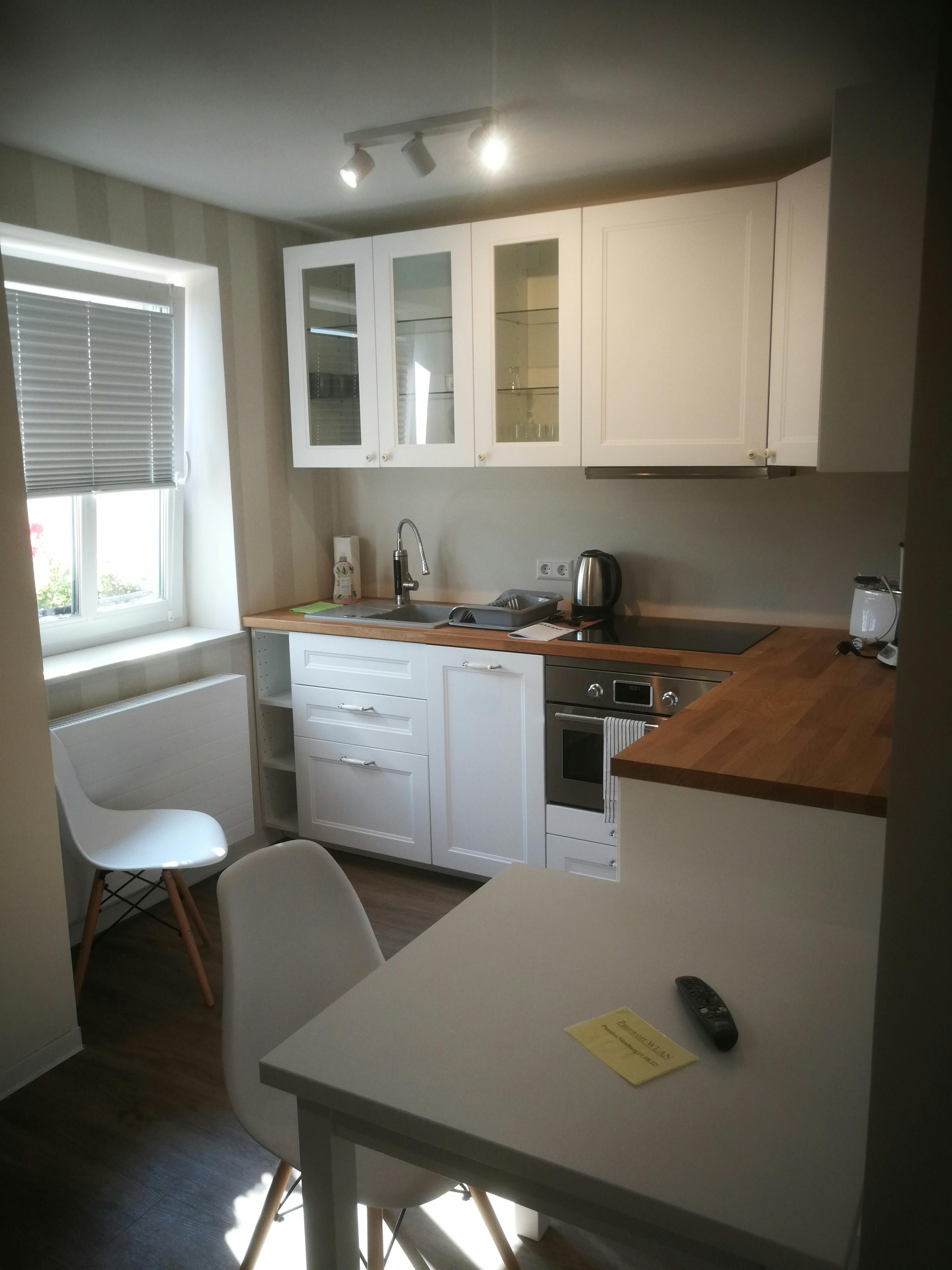 Küche ausgestattet mit Herd, Backofen/Mikrowelle, Abzugshaube, Kühlschrank, Geschirrspüler,Geschirr, Besteck, Kaffeemaschine, Toaster, Wasserkocher